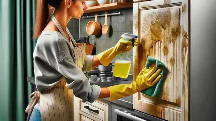 Špachtlí nebo prsty naneste pastu na mastná místa na fasádě skříněk.