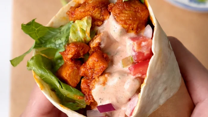 Prohřátá tortilla je pružná. Náplň skládejte do středu, ne až k okrajům. Nejprve list salátu – vytvoří bariéru proti vlhkosti a zabrání promočení tortilly. Pak kuře, zelenina a až nakonec bohatá vrstva omáčky.